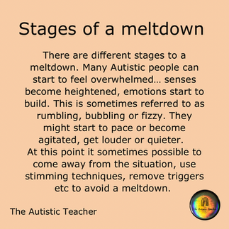 There are different stages to a meltdown. Many Autistic people can start to feel overwhelmed… senses become heightened, emotions start to build. This is sometimes referred to as rumbling, bubbling or fizzy. They might start to pace or become agitated, get louder or quieter. At this point, it sometimes possible to come away from the situation, use stimming techniques, remove triggers etc to avoid a meltdown.