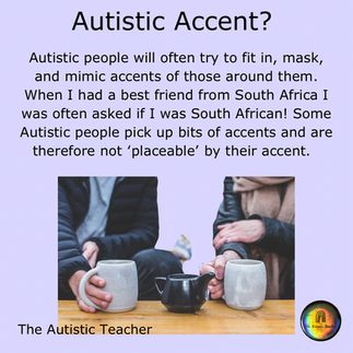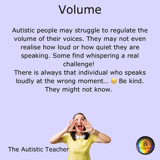 The tone of speech among autistic individuals also varies. It is often said that autistic people are very monotone. This can be true. However, the opposite can also be true! Autistic people can also be very 'sing-song' in their speech. This could be due to masking or mimicking those around to fit in. As a teacher, I’m very aware of my tone of voice… and am very aware that I might be boring people if I speak too 'monotone'! Some of us might be aware of this and overcompensate by using lots of expression!