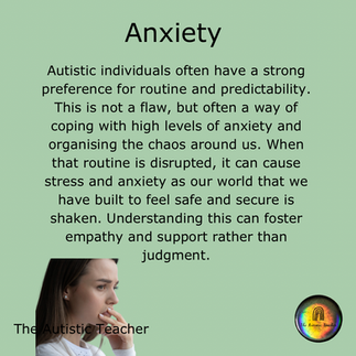 Autistic individuals often have a strong preference for routine and predictability. This is not a flaw, but often a way of coping with high levels of anxiety and organising the chaos around us. When that routine is disrupted, it can cause stress and anxiety as our world that we have built to feel safe and secure is shaken. Understanding this can foster empathy and support rather than judgment.